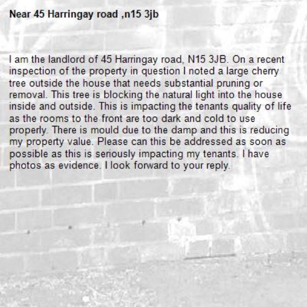 I am the landlord of 45 Harringay road, N15 3JB. On a recent inspection of the property in question I noted a large cherry tree outside the house that needs substantial pruning or removal. This tree is blocking the natural light into the house inside and outside. This is impacting the tenants quality of life as the rooms to the front are too dark and cold to use properly. There is mould due to the damp and this is reducing my property value. Please can this be addressed as soon as possible as this is seriously impacting my tenants. I have photos as evidence. I look forward to your reply.