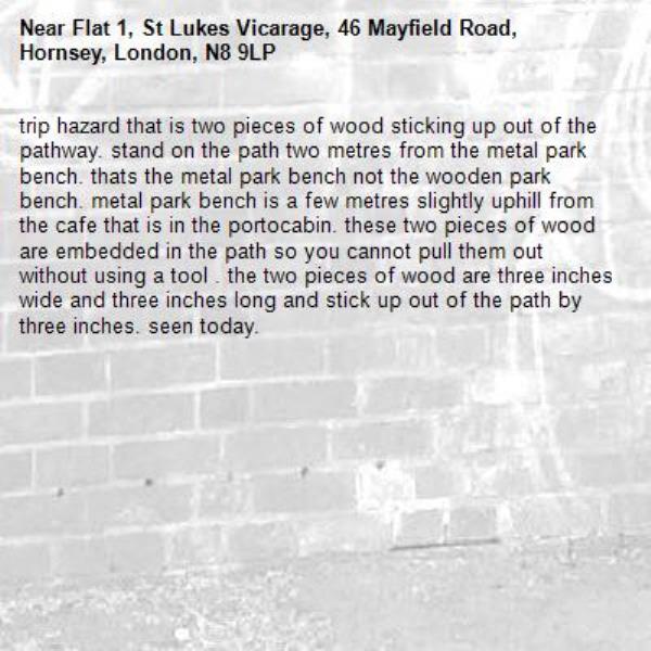 trip hazard that is two pieces of wood sticking up out of the pathway. stand on the path two metres from the metal park bench. thats the metal park bench not the wooden park bench. metal park bench is a few metres slightly uphill from the cafe that is in the portocabin. these two pieces of wood are embedded in the path so you cannot pull them out without using a tool . the two pieces of wood are three inches wide and three inches long and stick up out of the path by three inches. seen today.