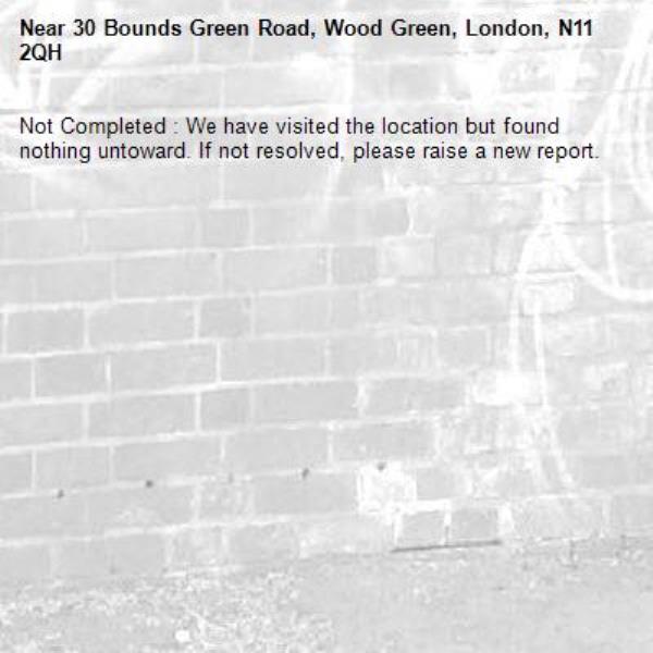 -30 Bounds Green Road, Wood Green, London, N11 2QH 15/04/2026 12:10 Not Completed : We have visited the location but found nothing untoward. If not resolved, please raise a new report.
