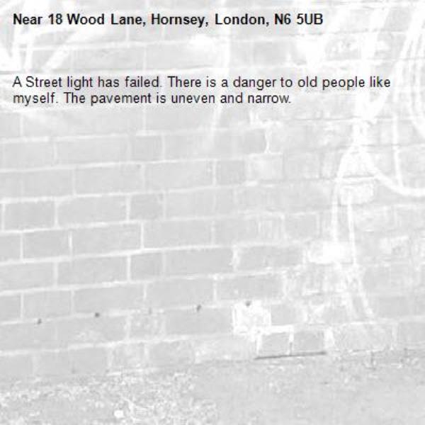 A Street light has failed. There is a danger to old people like myself. The pavement is uneven and narrow.