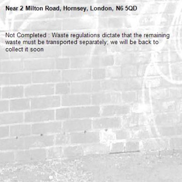 -2 Milton Road, Hornsey, London, N6 5QD 09/04/2026 07:34 Not Completed : Waste regulations dictate that the remaining waste must be transported separately; we will be back to collect it soon