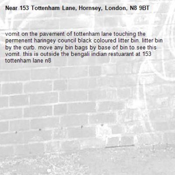vomit on the pavement of tottenham lane touching the permenent haringey council black coloured litter bin. litter bin by the curb. move any bin bags by base of bin to see this vomit. this is outside the bengali indian restuarant at 153 tottenham lane n8