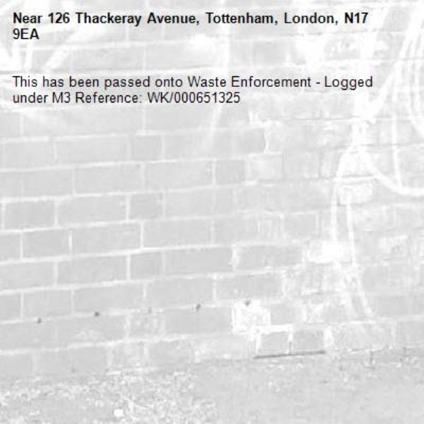 This has been passed onto Waste Enforcement - Logged under M3 Reference: WK/000651325-126 Thackeray Avenue, Tottenham, London, N17 9EA 15/04/2026 10:29 This has been passed onto Waste Enforcement - Logged under M3 Reference: WK/000651325