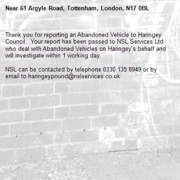 -61 Argyle Road, Tottenham, London, N17 0BL 09/04/2026 10:41 Thank you for reporting an Abandoned Vehicle to Haringey Council. Your report has been passed to NSL Services Ltd who deal with Abandoned Vehicles on Haringey's behalf and will investigate within 1 working day. NSL can be contacted by telephone 0330 135 8949 or by email to haringeypound@nslservices.co.uk