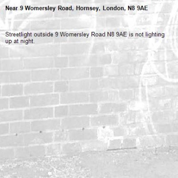 Streetlight outside 9 Womersley Road N8 9AE is not lighting up at night.