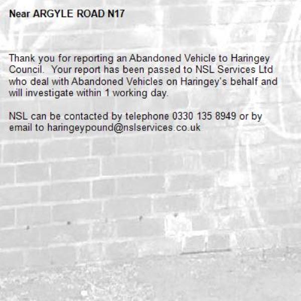 -ARGYLE ROAD N17 09/04/2026 10:38 Thank you for reporting an Abandoned Vehicle to Haringey Council. Your report has been passed to NSL Services Ltd who deal with Abandoned Vehicles on Haringey's behalf and will investigate within 1 working day. NSL can be contacted by telephone 0330 135 8949 or by email to haringeypound@nslservices.co.uk